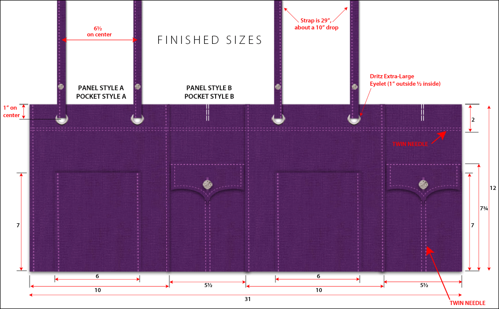 - Find the two 11″ wide x 15″ high Style A side panels and the two finished Style A Pockets (the pockets with the finished sides and top).