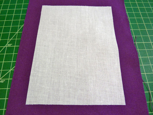 - Find the 11″ x 6½” exterior base panel and the 10″ x 5½” firm interfacing panel. Center the interfacing on the wrong side of the base panel so there is ½” of fabric showing beyond the interfacing on all four sides. Following manufacturer’s instructions, fuse in place.