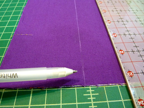 - Find the exact center of the pocket panel. Using a fabric pen or pencil, draw a vertical line down the center. You are working on the right side of your fabric; make sure your fabric pen will easily wipe away or will vanish with exposure to air or the heat of an iron.