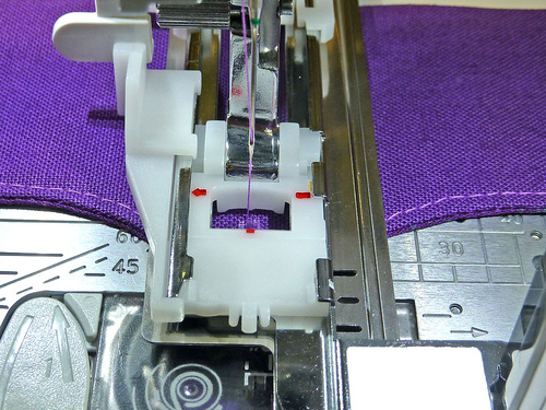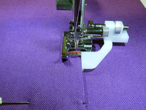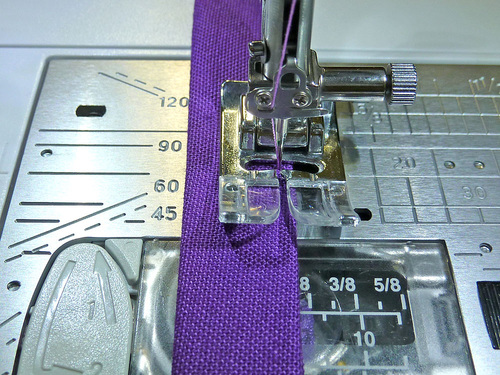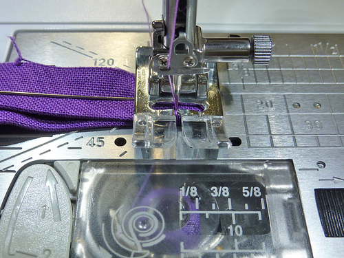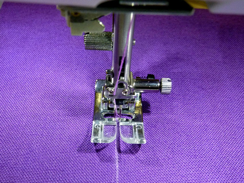 - The machine should still be threaded with the contrasting thread in the top and bobbin and the stitch should still be lengthened.