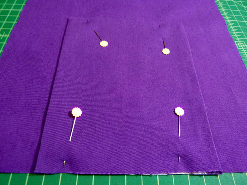 - To do this, simply pinch about ¼” at the exact center of each side panel. Pin in place. You are pinching right sides together so the tuck is to the inside of the bag.