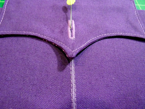 - Pin a pocket flap ½” above each base pocket, centering the point of the pocket flap on the base pocket’s vertical topstitching, which means the sides of the flap should sit just a bit over ½” in from each edge of the side panel.