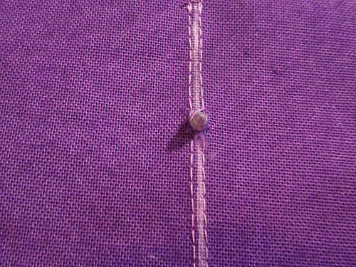 - Make a small hole with an awl or sharp scissors at this marked point in the pocket base panel. You are cutting through the topstitching to center the button; you can add a dab of seam sealant, such as Fray Check, if you are worried your fabric will fray.
