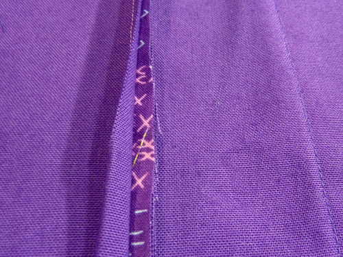 - Following the original crease lines, fold the exterior facing back down into position (½” and then 2″). The facing should cover and enclose the top raw edge of the lining. Hand baste the facing in place.