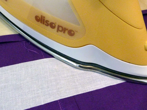 - Find the 2″ x 31″ strip of lightweight fusible interfacing. Place the interfacing on the wrong side of the panel, aligning the top edge of the interfacing with the second crease line. Following manufacturer’s instructions, fuse in place.