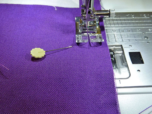 - Remove the project from the machine. Turn the corner and pin along the next side of the bag (one of the A panel sides). To help make the turn, you can clip the bag at the corners. You are clipping into the corner at a diagonal at a depth of about ⅜”. This frees up the seam allowance so you can stitch each side of the bag independently.