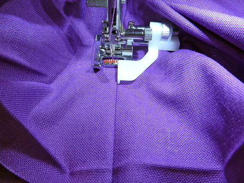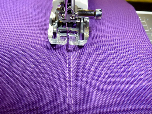 - Re-thread the machine with construction thread in the top and bobbin. Re-set the stitch length to normal.
