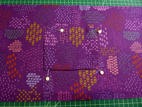 - Place the fused lining panel right side up and flat on your work surface. Position the pocket at the center of the panel. It should sit 3″ up from the bottom raw edge of the panel and 11″ in from the right raw side edge of the panel. Pin the pocket in place along both sides and across the bottom.