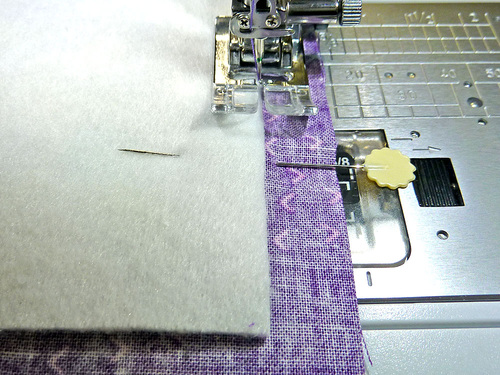 - Starting at the corner of the interfacing, and using a ½” seam allowance, stitch along this first side. Stop the seam at the opposite corner of the interfacing. In other words, your seam is starting and stopping ½” in from the edge of the base panel.