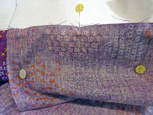 - Place the side panels right side up and flat on your work surface. Center a pocket on each panel. The bottom raw edges of the pocket should be flush with the bottom raw edge of the side panel. Pin in place.