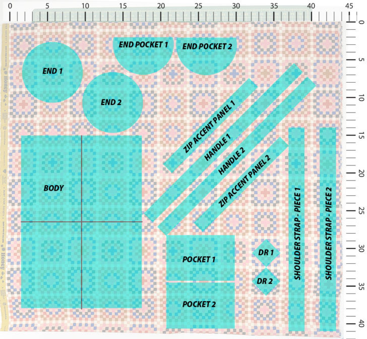 NOTE: These are all the cuts required for the barrel bag. Following this section is a detailed set of instructions and cutting diagram to follow should you wish to use the exact exterior fabric we used for our sample. It contains specific fussy cutting and pocket-to-base-panel cutting details.