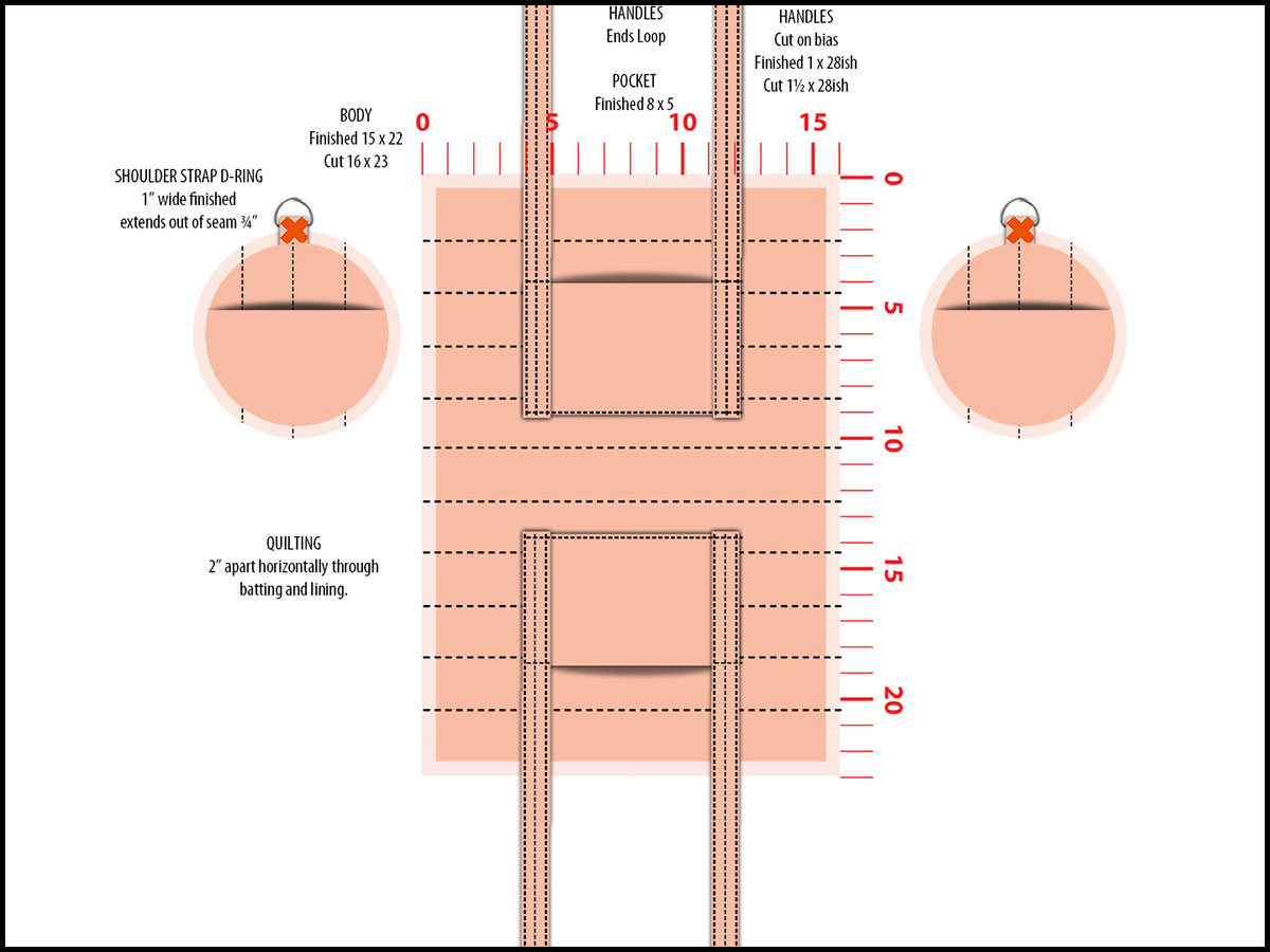 NOTE: We used single-sided fusible fleece, which worked fine, but if you’re new to working in 3D and/or with multiple layers, the double-sided fusible keeps the layers together even better and makes the quilting very easy. - 3½ yards of 1½” wide webbing for the handles and adjustable strap; we used 1½” polyester belting in black