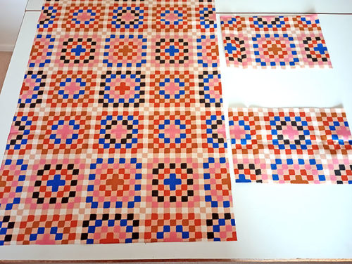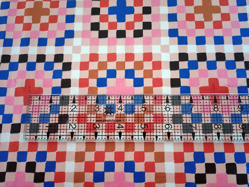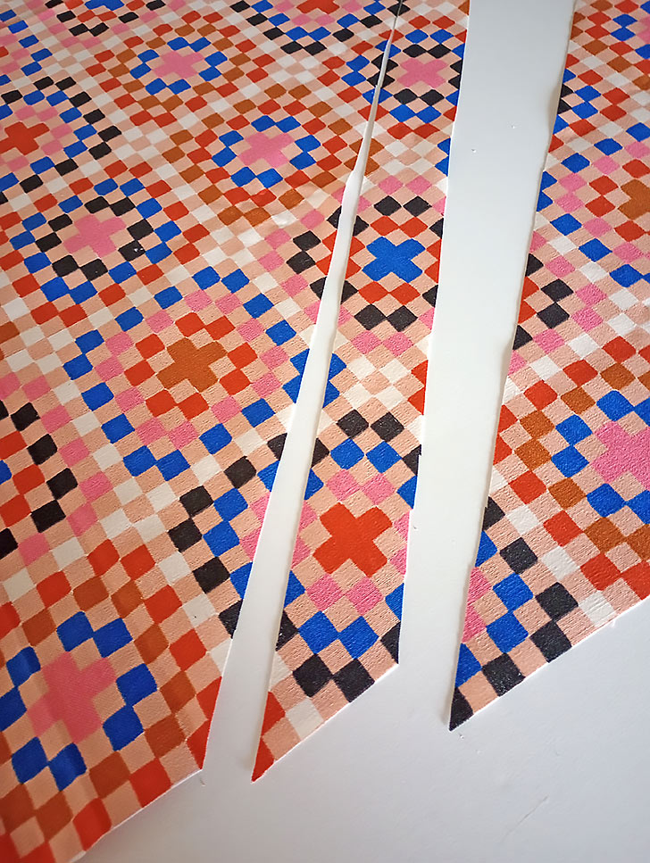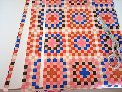 - In the case of all our straight cuts, we fudged our measurements just a tiny bit here and there in order to make cuts on the closest line of squares. With this type of strong graphic motif, it is easiest to use scissors and simply follow the dominant lines.