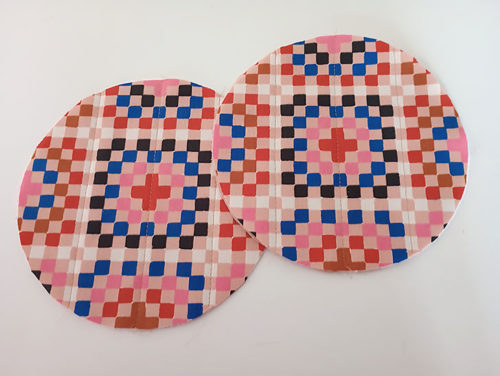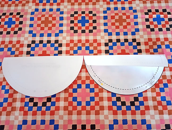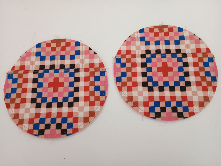 - Place a pocket on each base panel. The raw curved edges of both layers should be flush. And, if you fussy cut, your pocket motif should match up against the base panel.