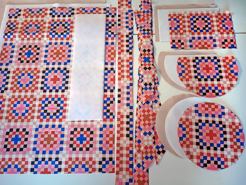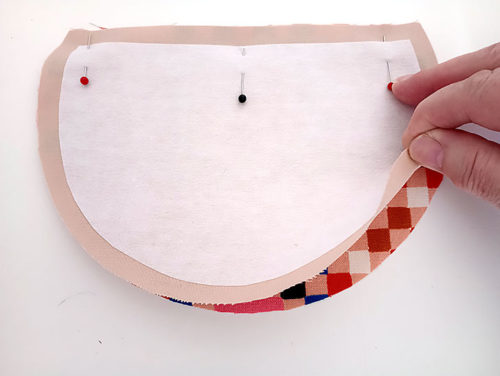 - Find the elements for the round end pockets: exterior layer, lining layer and interfacing.