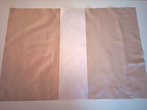 - Place an interfacing layer on the wrong side of each lining layer. The interfacing should be centered so there is ¼” of fabric showing beyond the interfacing top and bottom. The sides of the two layers are flush. Following manufacturer’s instructions, fuse in place.