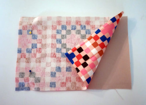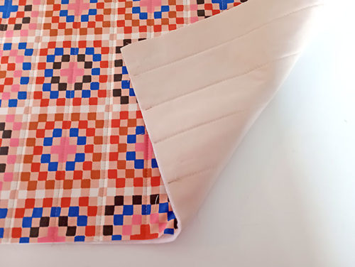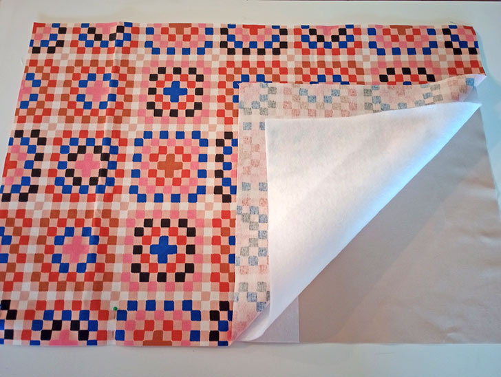 - Place the lining panel wrong side up (interfacing panel side up) and flat on your work surface. Place the fusible fleece panel on top of the lining. All four edges should be flush. If using one-sided fusible, the fusing side should be facing down against the lining. Following manufacturer’s instructions, fuse in place.