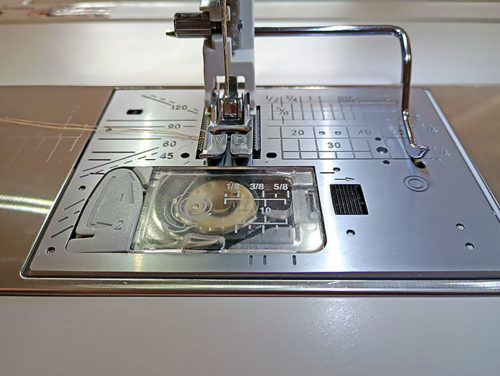 - Keep the machine threaded with thread to match the lining in the bobbin and exterior thread on top. Re-set for a standard straight stitch. We continued to use our AcuFeed™ narrow VD foot. You could also choose to use a standard Zipper foot.