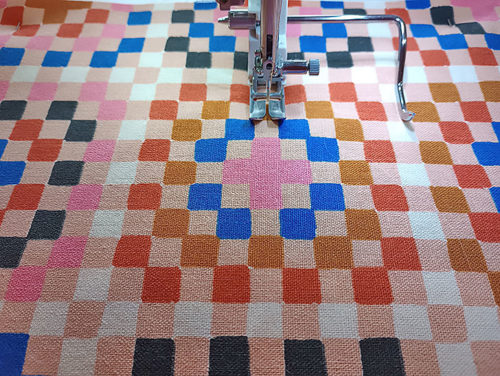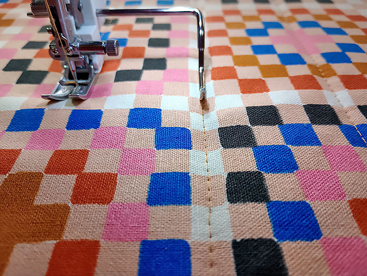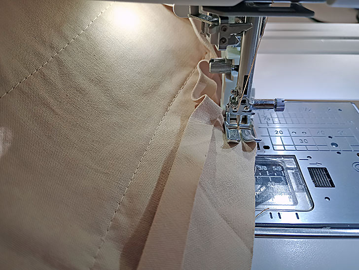 - Re-set for the slightly lengthened straight stitch. You are going across a number of layers at this point, so if you haven’t switched to an Even Feed/Walking foot or engaged your machine’s built-in fabric feeding system, now is the time to do it.