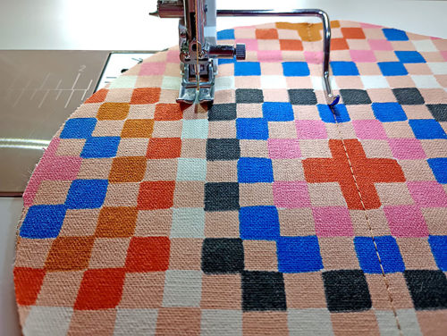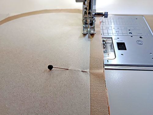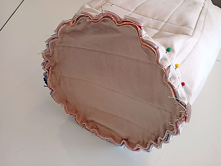 NOTE: This was our choice for a clean finish to the lining, but it is not mandatory. You could choose your favorite machine sewn seam finish. Or review our four-part seam finishing series to pick a favorite. - Repeat to inset the remaining round end panel in the same manner.