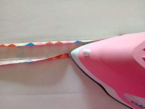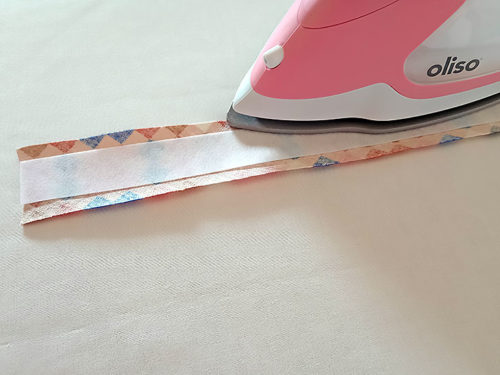 - Find the TWO 17″ strips of bias cut exterior fabric and the two 17″ strips of the 1″ interfacing.