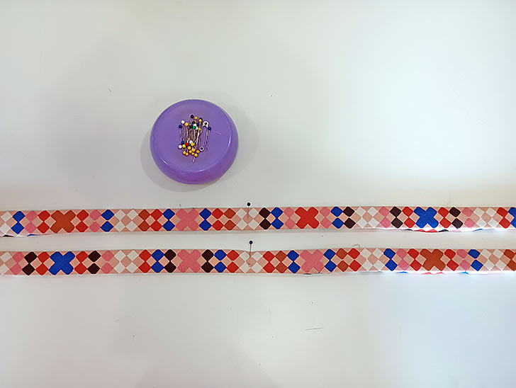 - Find the two 24″ bias cut strips from the lining fabric. You’ll use these to bind the interior seam allowances.