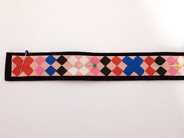 - The adjustable strap is cut straight of grain following the fabric’s dominant line of white squares. It is five squares wide, which is a generous 1½” in width, but it makes sure the line of white squares is centered. We cut two lengths approximately 28″ in length, joining them to create the final required 54″ length.