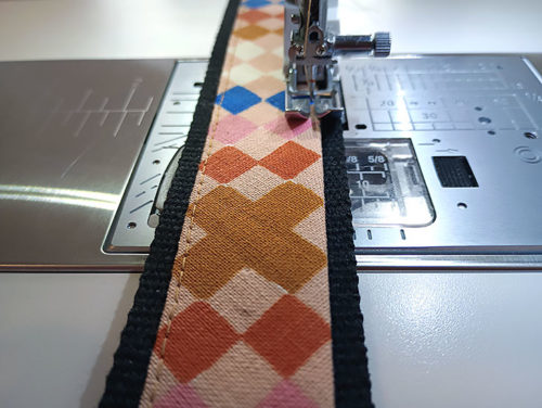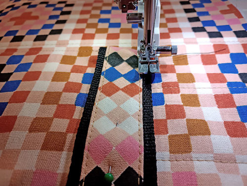 - Edgestitch the fabric strip to the webbing along both sides. Repeat on both handles.