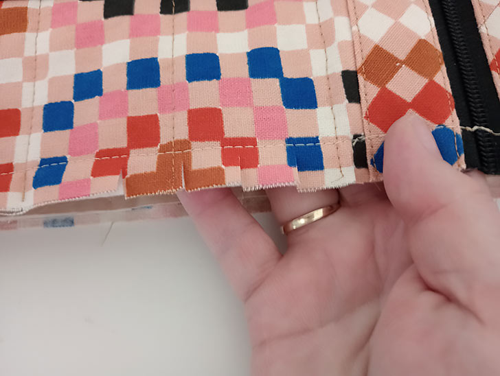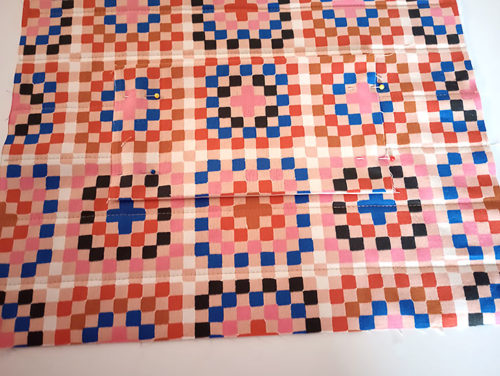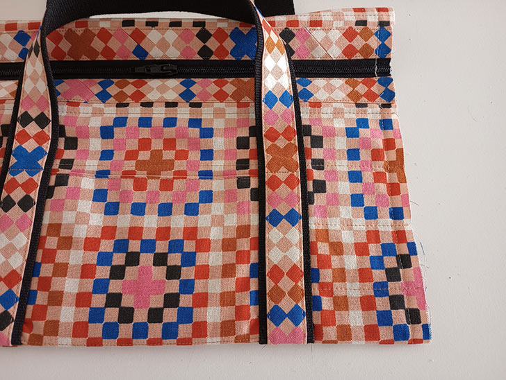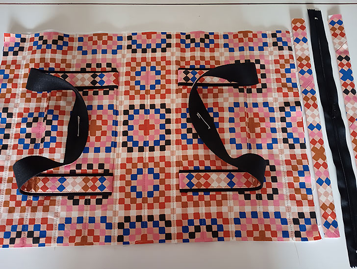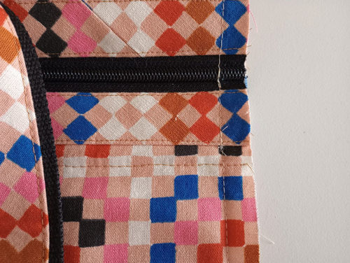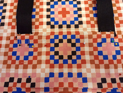 - For the bias trim for the handles and zipper trim, we used the little white checkerboards as our center line. We started with more length than we would ultimately need in order to have plenty to work with to match the motif length to length. The strips were cut in random lengths, joined into a continuous strip, then cut to length during construction. With careful joints (matching the motif so it appears continuous), the little white checkerboards are all the same distance apart, and the handles and zipper trim have lovely centered motifs.