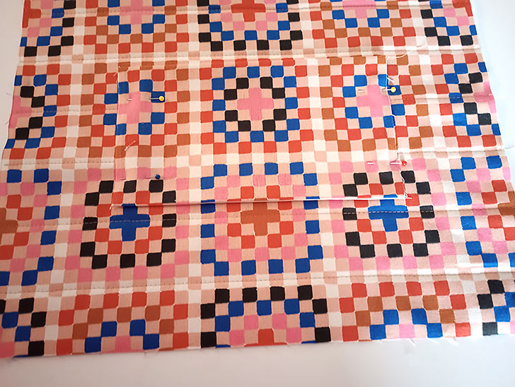 - The pocket top should sit approximately 4½” up from the raw edge of the main panel. The bottoms of the two pockets should be approximately 4½” apart. In addition, if you chose to fussy cut your pocket to match the base panel, this will allow you achieve perfect placement. Pin each pocket in place along its raw side edges.