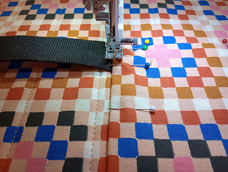 You will be working with multiple layers, plus some thickness comes into play with the webbing handles and strap as well as the quilting on the body and the end panels. We chose to engage the Janome AcuFeed™ Flex built-in fabric feeding system for the entire construction, using the AcuFeed™ narrow VD foot the majority of the time. An Even Feed/Walking foot would be another option. You’ll see in the instructional photos below that we added a Quilting Guide Bar, which made quick work of our evenly spaced, straight line quilting. A layer of fusible fleece between the exterior and lining provides just the right amount of loft, dense enough to see the quilting but without the bag becoming too soft.