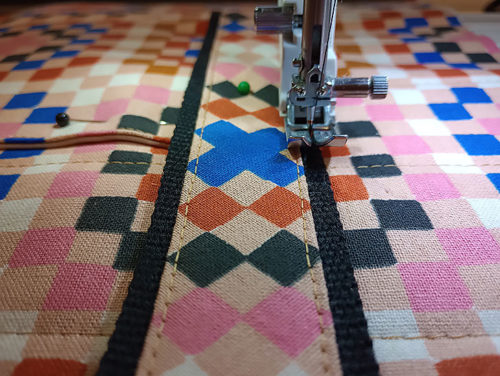 - Re-set to edgestitch along the inner edge of that side of the handle, starting at the bottom and ending at the top of the pocket. Stop and lock your stitch.