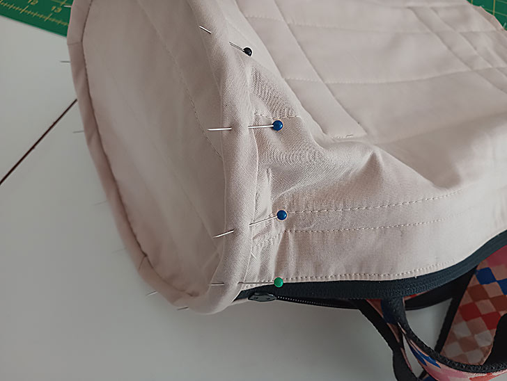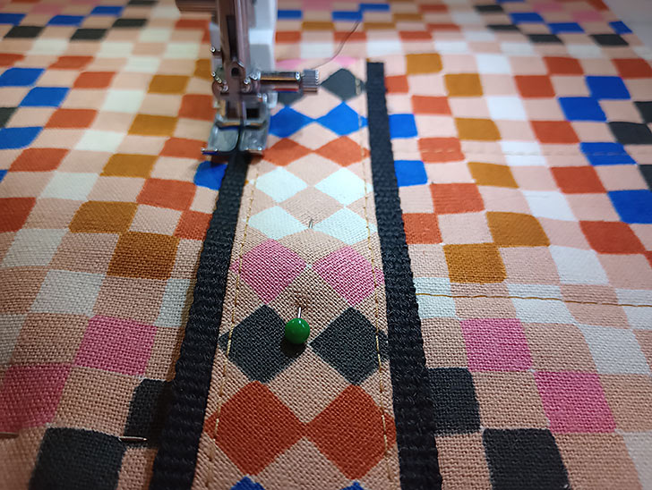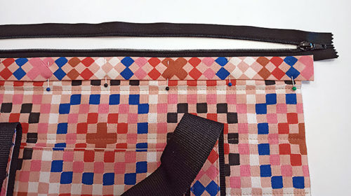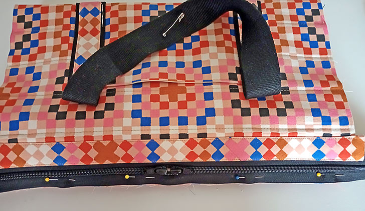 - Fold the handle into its finished “up” position, covering the raw sides of the pocket. Pin in place.