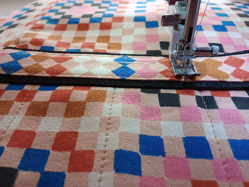 - Slightly lengthen your stitch and edgestitch across each pocket top. This edgestitching should match the edgestitching on the front/back pockets.