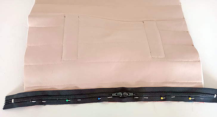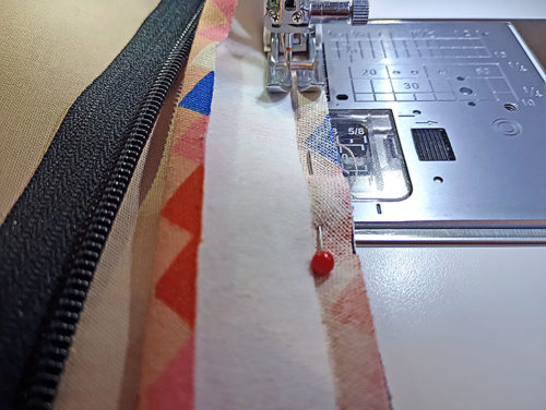 - Find the remaining accent strip and, opening the one folded edge, stitch it right sides together with the zipper – just as you did above.