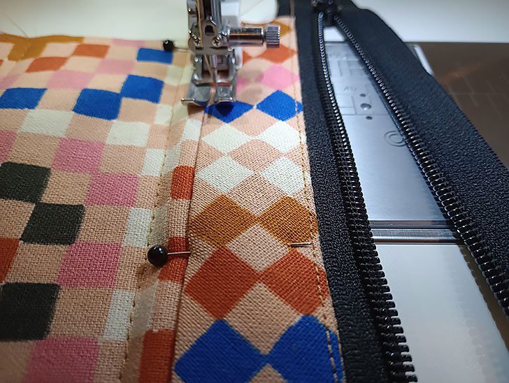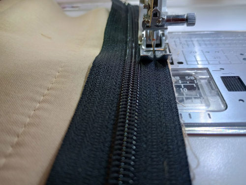 - As with all zipper insertions, when you see you are approaching the zipper pulls, stop with your needle in the down position. Raise the presser foot and twist the layers slightly so you can access the pulls to move them out of the way of the foot. Once clear, drop the presser foot, re-position the layers, and finish the seam.