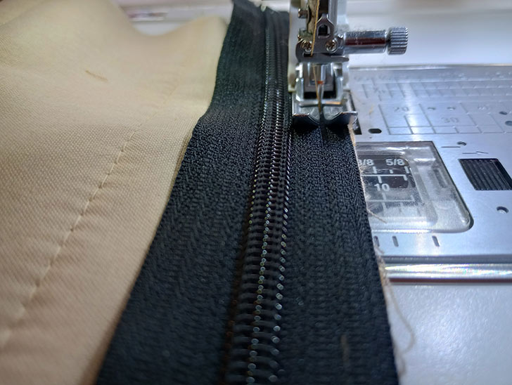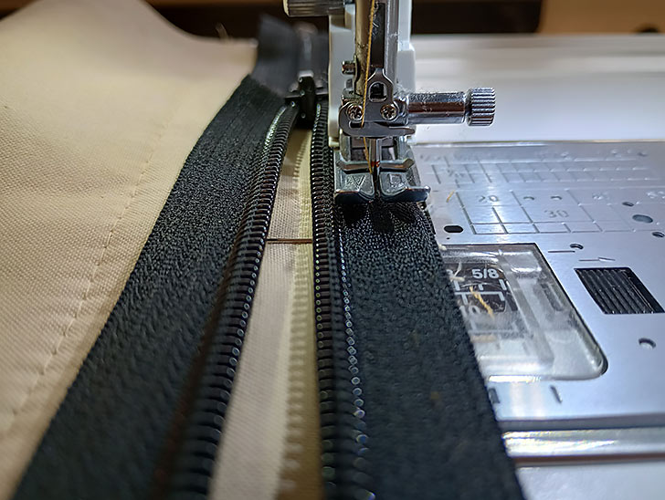 - Double stitch over the ends of the zipper coil as you go across it. When done, trim away any excess zipper tape and/or accent strip so everything is flush.