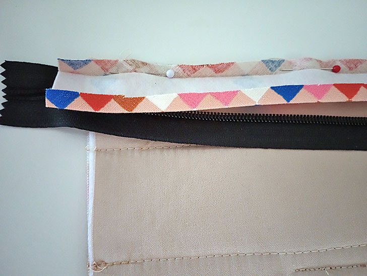 - Find one of the 17″ accent strips. Open up one folded side. Place the strip right sides together with the zipper. The raw edge of the un-folded side should be flush with the zipper tape/panel edge. Pin in place, sandwiching the zipper between the accent strip and lining.
