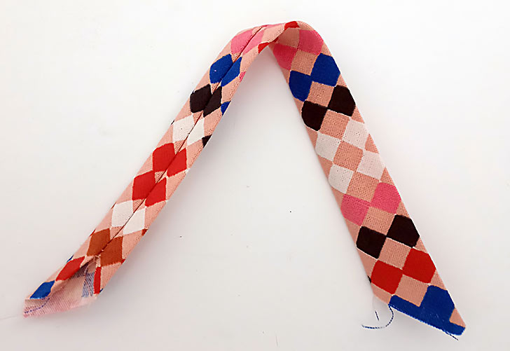 - Fold the bias strip in half, right sides together so it is now 1¼” x 5″. Pin in place and stitch with a scant ¼” seam allowance, forming a long, thin tube.