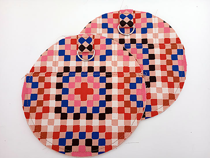 - Pin a D-ring in place on each round end panel. It should be centered over the top of the pocket with the raw ends of the D-ring loop flush with the raw edges of the quilted base panel. Pin in place, then machine baste in place about ¼” from the raw edge.