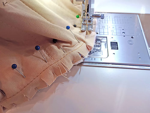 - Place the exterior and lining right sides together and pin along the top straight edge.