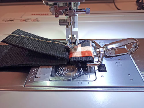 - We did use a standard folded-under hem finish when attaching to the slide buckle and the final swivel hook, which you see below.
