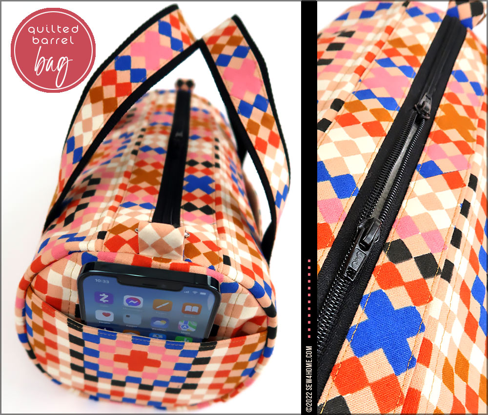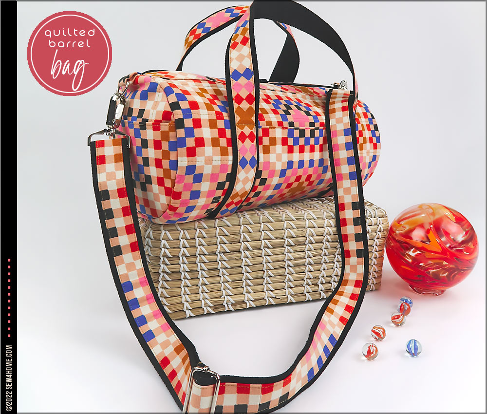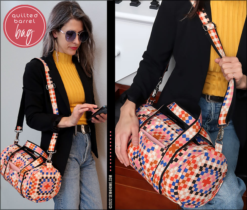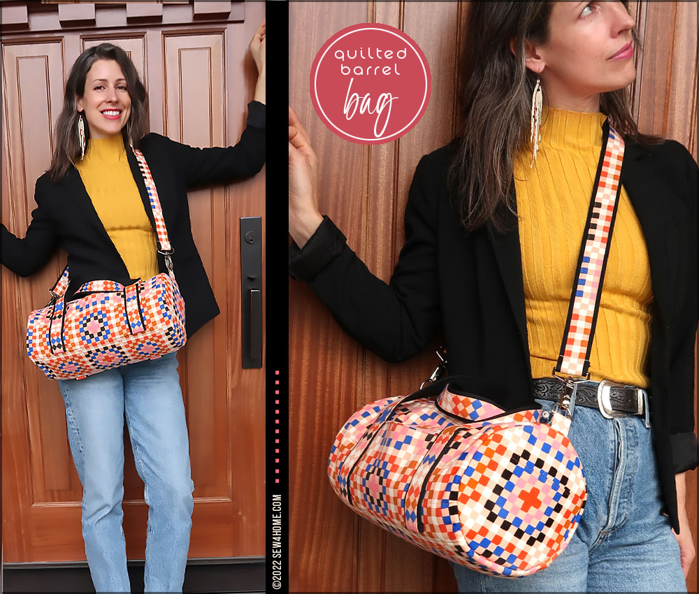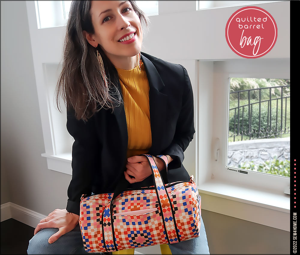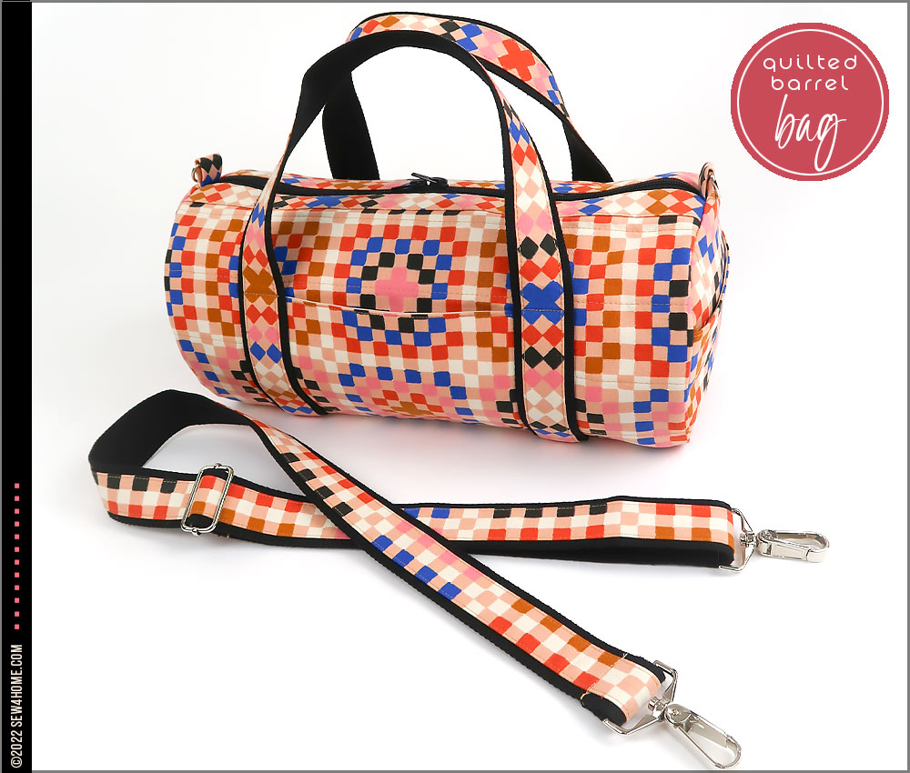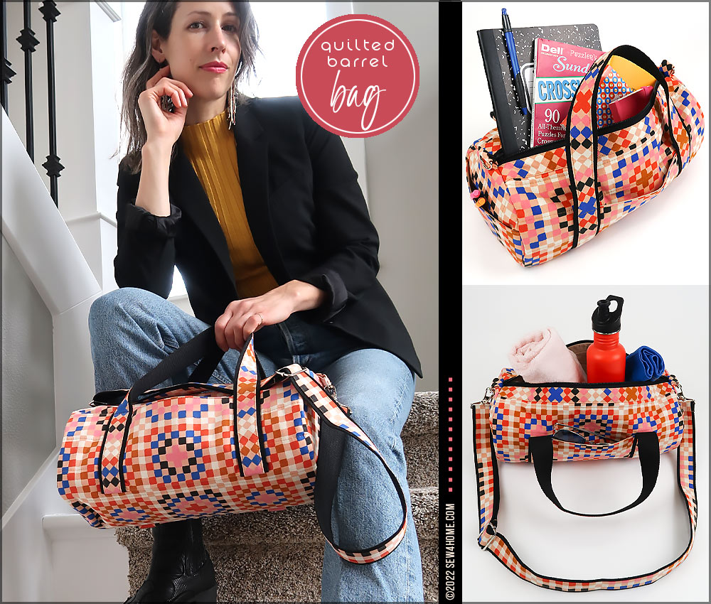 When you imagine a duffle style tote, the picture in your mind probably conjures something made out of a heavy duty fabric in classic tones of tan or brown. We have a couple projects right here on S4H that match the traditional view. But for this stand-out-from-the-crowd barrel bag, we took a different path, using a lightweight canvas in a bold and colorful print.