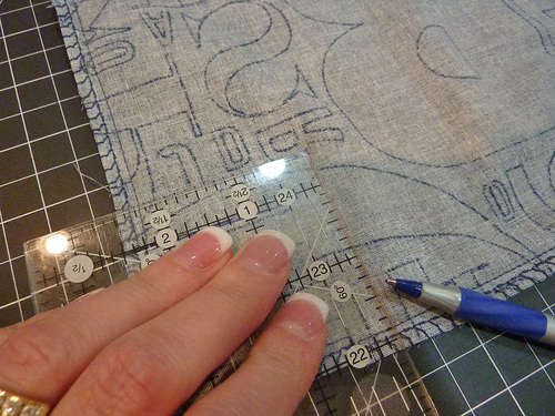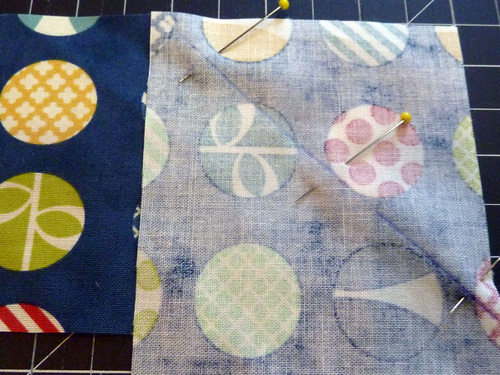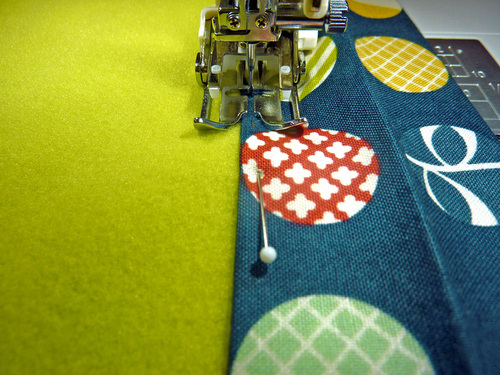 - Stitch together the strips of binding end-to-end to make one continuous length. As with all binding (bias or straight cut), criss-cross the angled ends of the strips. Then, draw a diagonal line across the intersection. Pin together along the diagonal.