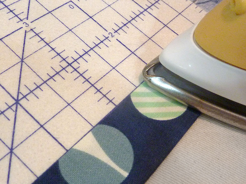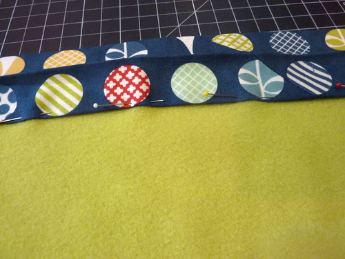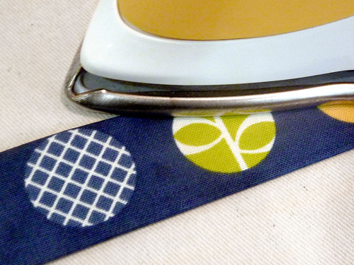 NOTE: As mentioned above, we fussy cut our fabric for a perfect reveal of one row of dots front and back. When folding, we made sure this fussy cut remained true. - Open the binding wrong side up so the crease line is visible. Press in each long side ½”. Then re-fold again, wrong sides together along the center crease line, aligning the folded edges. Press flat.