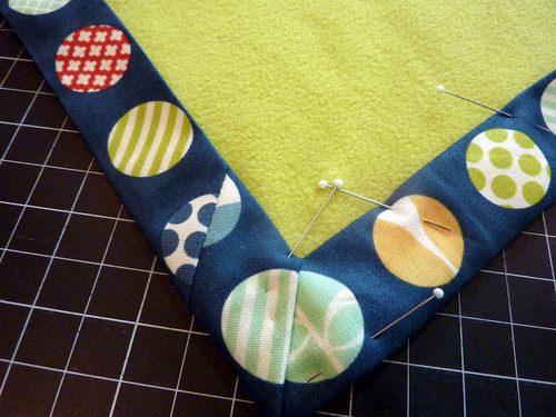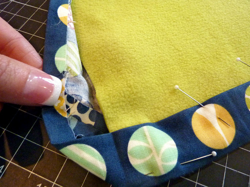 - Pin in place all around, again making a pretty diagonal fold at each corner. Hand stitch the backside of the binding in place – as you might a traditional quilt binding,