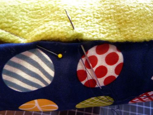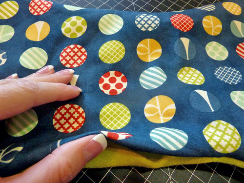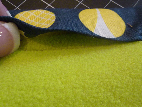 NOTE: Stitching cotton to fleece can be a bit tricky due to the stretchiness of the fleece. If you are worried about keeping all the layers even, and/or if you do not have access to a Walking foot or a built-in feeding system, try the alternate binding steps below.