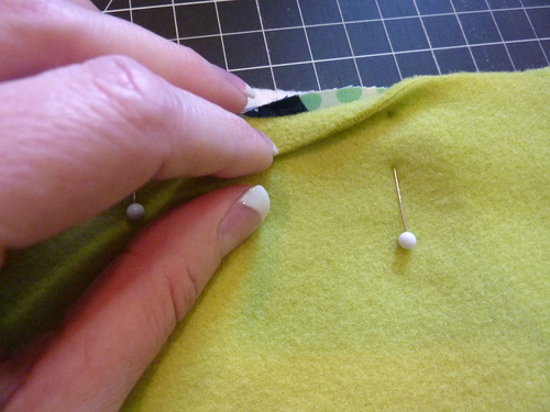 - Pin in place all around along the one folded edge. As above, fold in each corner to create a pretty diagonal point.
