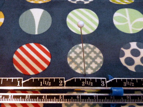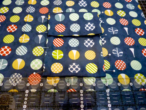 - From the binding fabric, cut FIVE – SIX 3″ x width of fabric (WOF) strips; we cut six. You need approximately 220″ to bind the entire blanket. We fussy cut our strips so the dots were centered to allow one row to show on each side when folded and stitched in place.