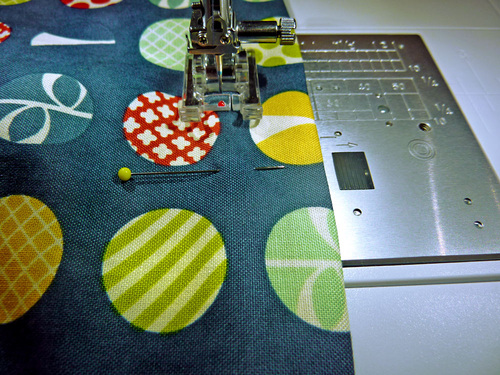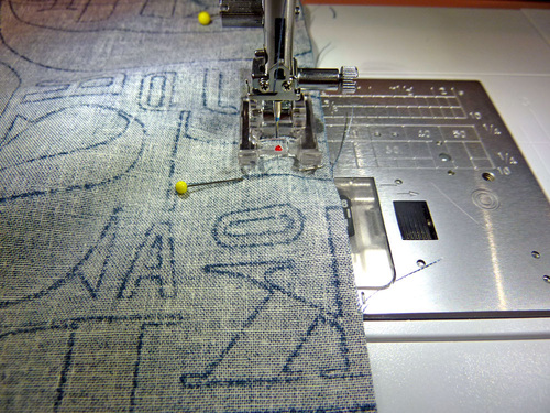 - Topstitch all around, running the seam close to the bottom fold of the channel. We stitched on the right side and used the handy 1″ throat plate markings on our Janome as our seam measuring guide. We love that most of the Janome machines have guide lines that extend out onto the needle plate and even out onto the throat of the machine.